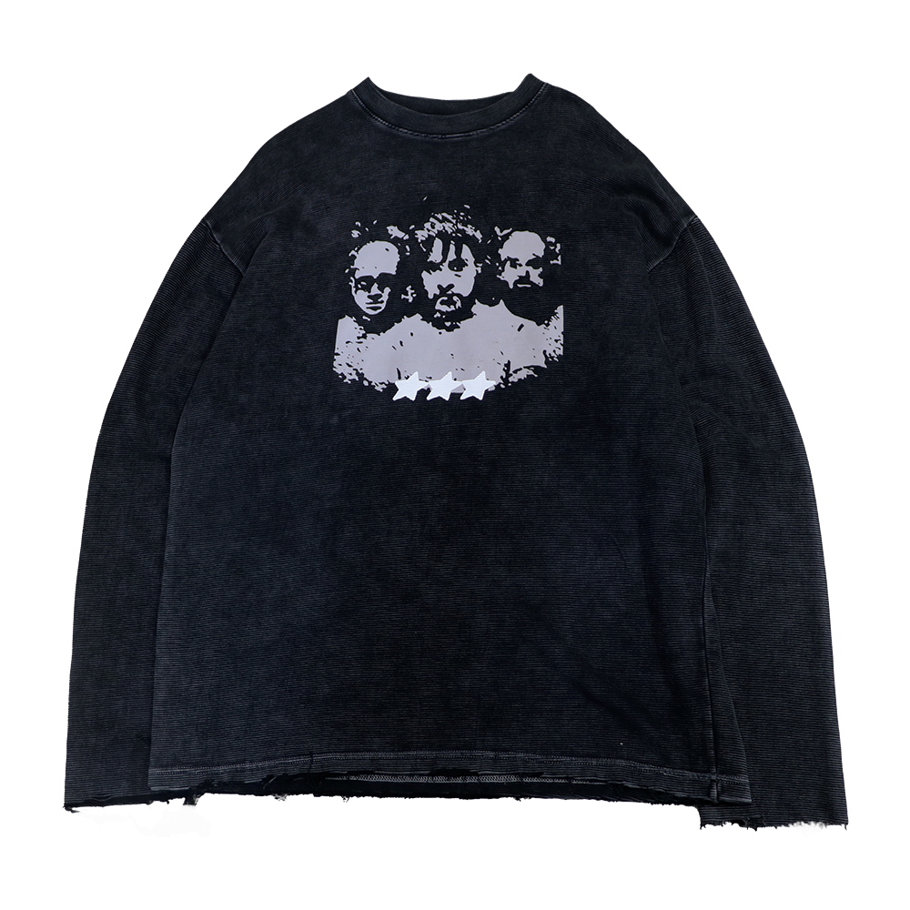 This full sleeve is made with one of a kind ribbed fabric with raw edge sleeves which give a raw finish to the garment. It has been acid washed to perfection. The design speaks about cinema as an art form taking inspiration from the Indian film ‘Delhi Belly’. The model is wearing a L for an oversized look. You can go for smaller sizes.