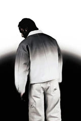 The Obsidian Drift Jacket captures movement in stillness — a gradient fade that dissolves from deep black into pure white. Crafted from dense cotton twill, it pairs structure with flow, while the sculpted seams and contrast collar carve out a sharp silhouette. Finished with a metallic emblem at the chest, it carries both weight and quiet precision.
