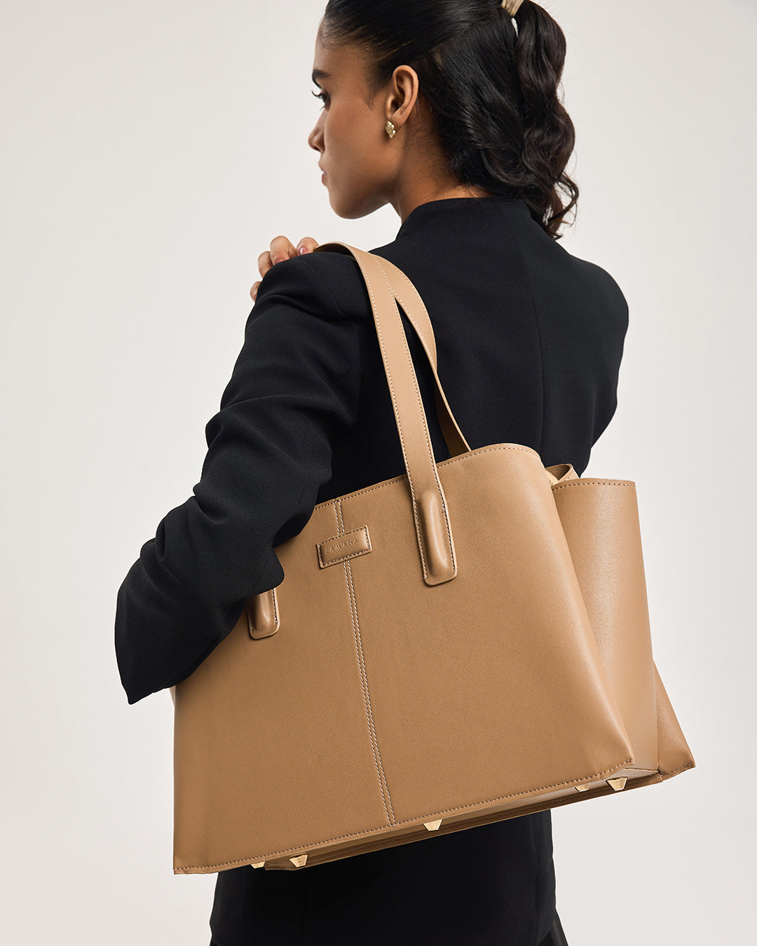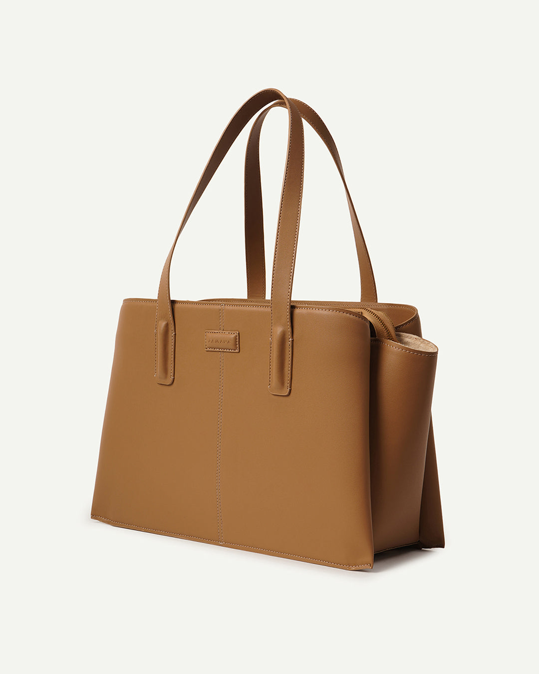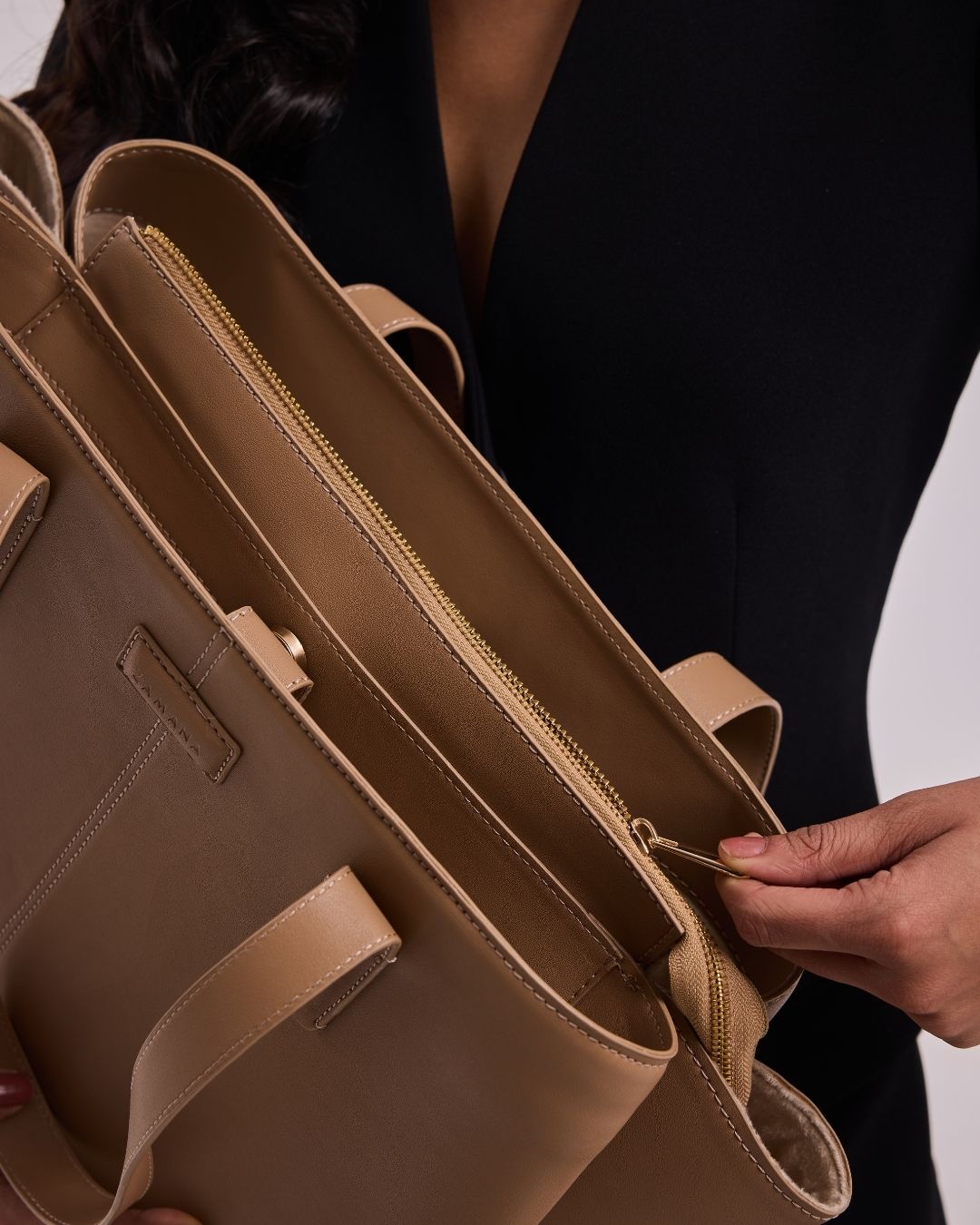 With everything from a structured cut to a functional design, She Means Business is the ultimate companion for any working professional.The mid section can fit a maximum size laptop of 16 inches (diagonally measured) as it can be zipped down.The side pockets can fit upto a 13 inches laptop besides other files and daily use items.She Means Business has pockets, which are on the inside and makes sure that you always stay organised.In addition, the shoulder straps that measure 2cm wide give you comfort.