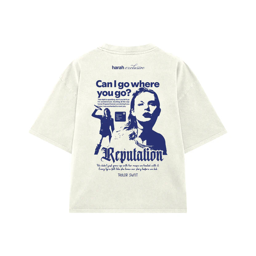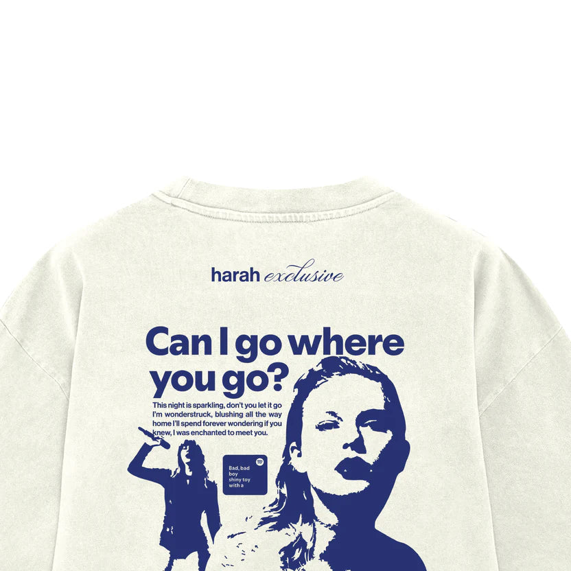 Crafted for the hopeless romantics hiding behind black nails and heavy playlists, the Swift Sins Tee is a quiet rebellion wrapped in soft cotton. On the front, a whisper of longing: “Can I go where you go?” — a line that hits harder at 2AM when silence is the only thing answering back.