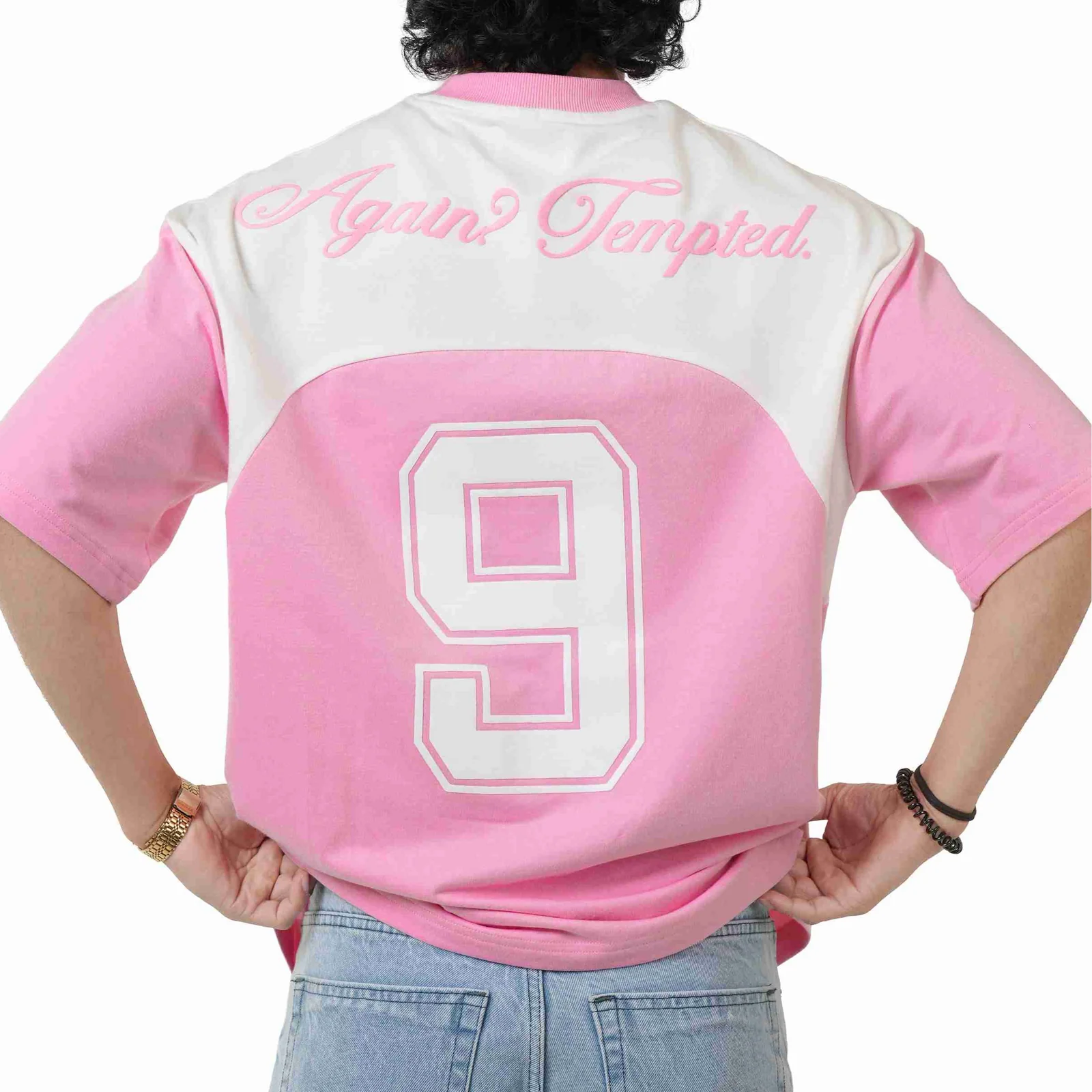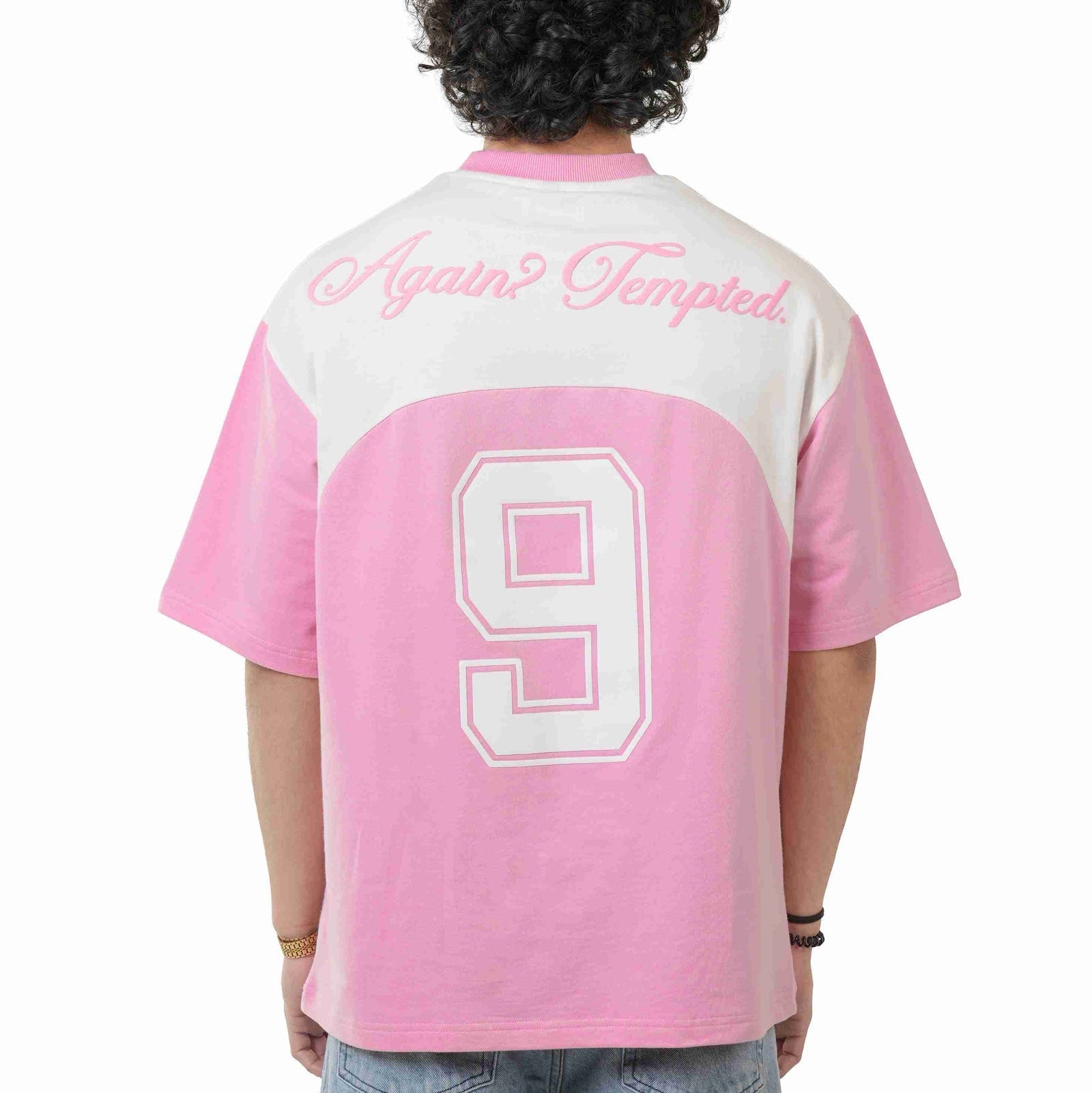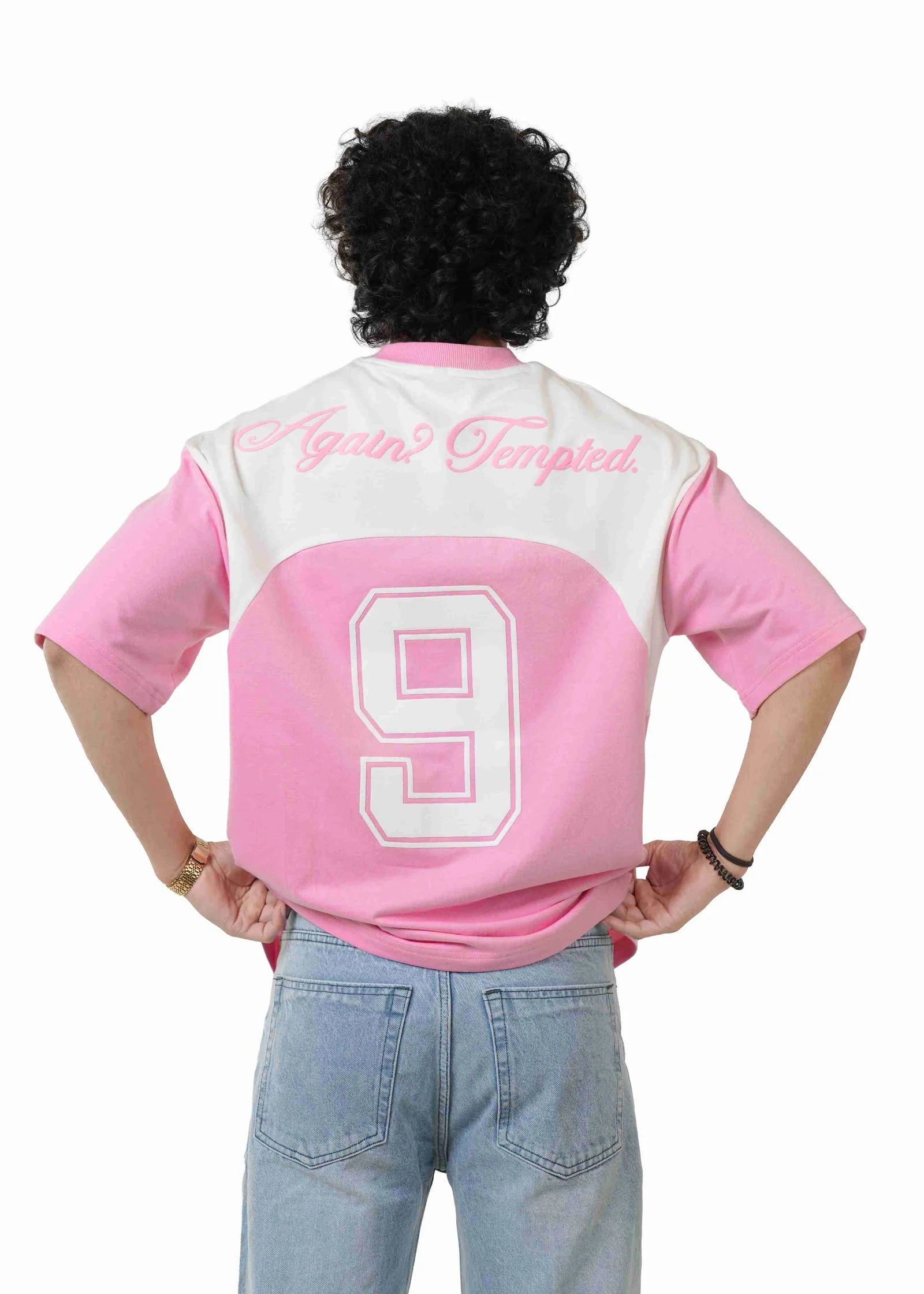 This 260 GSM French terry cotton T-shirt is designed to blend soft aesthetics with bold, nightlife-ready detailing. Available in two refined shades—Baby Pink and Off-White—it delivers a clean yet statement-driven look. Crafted from premium French terry cotton, the fabric offers a smooth, substantial feel with breathable comfort and durability. Made specially for club and house parties, the front features a minimal printed logo for a refined finish, while the back stands out with a bold puff print reading “AGAIN TEMPTED” alongside the signature 9, adding depth, texture, and standout appeal under lights. Combed and bio-washed for lasting softness, this tee is built for elevated after-dark wear.